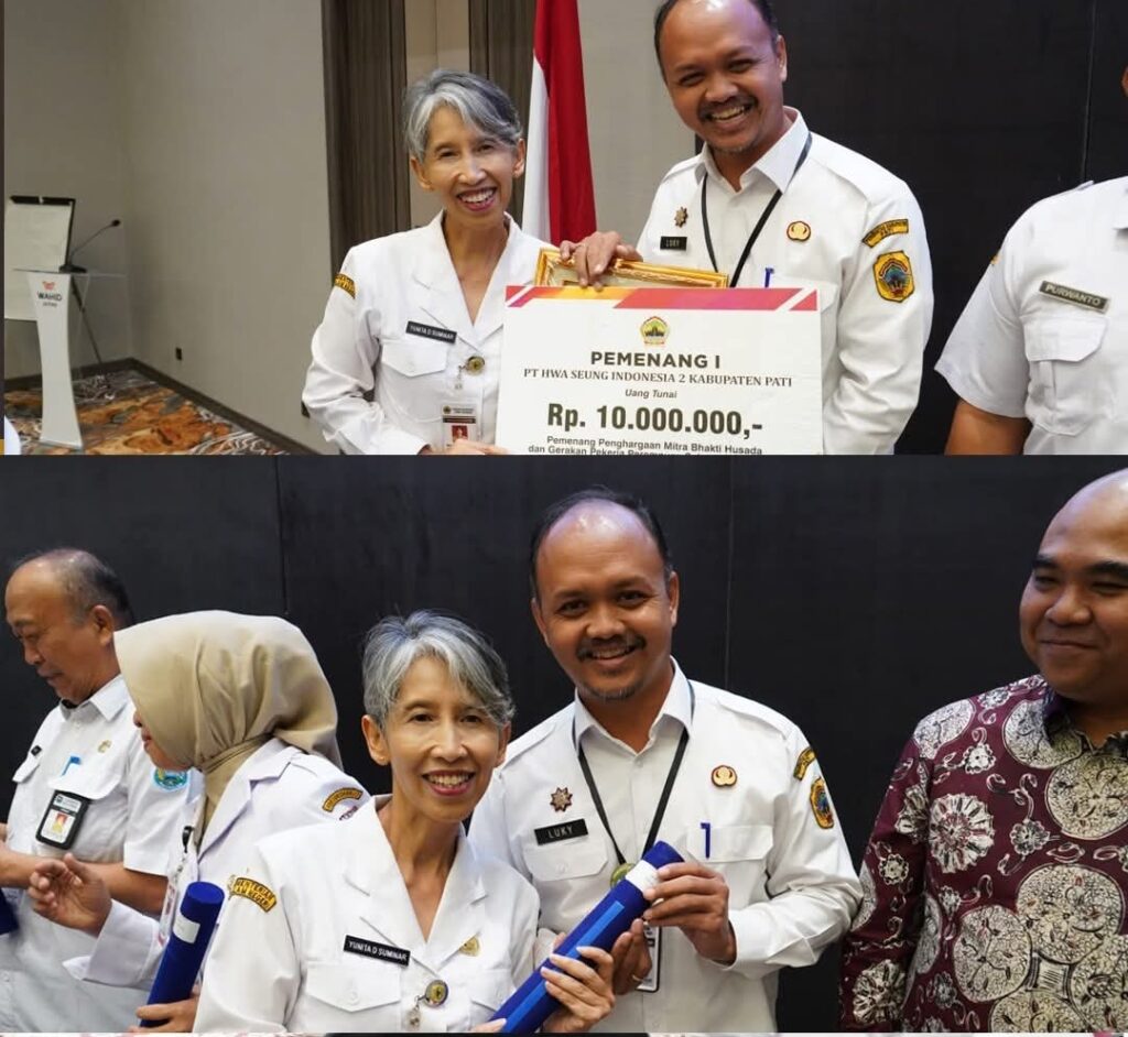 Pada Acara Penerimaan Penghargaan Kesling 2025 yang dilaksanakan Rabu (10/12) di Hotel Wahid Prime Salatiga, Kabupaten Pati meraih Penghargaan Mitra Bhakti Husada sebagai Juara 2 Nasional atau Terbaik 1 se-Jawa Tengah untuk kategori Program Perlindungan Pekerja Perempuan Kemenkes yang diterapkan oleh PT. Hwa Seung Indonesia (HWI) II.