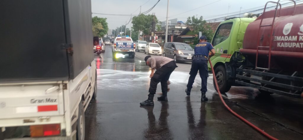 Warga yang melihat kejadian tersebut langsung melaporkan kepada Polsek Pati Kota dan Polresta Pati. Petugas Polsek Pati Kota bersama Satlantas Polresta Pati segera mendatangi lokasi, melakukan pengaturan lalu lintas, sterilisasi area, serta berkoordinasi dengan Damkar Kabupaten Pati agar dilakukan pembersihan menggunakan air dan detergen.
